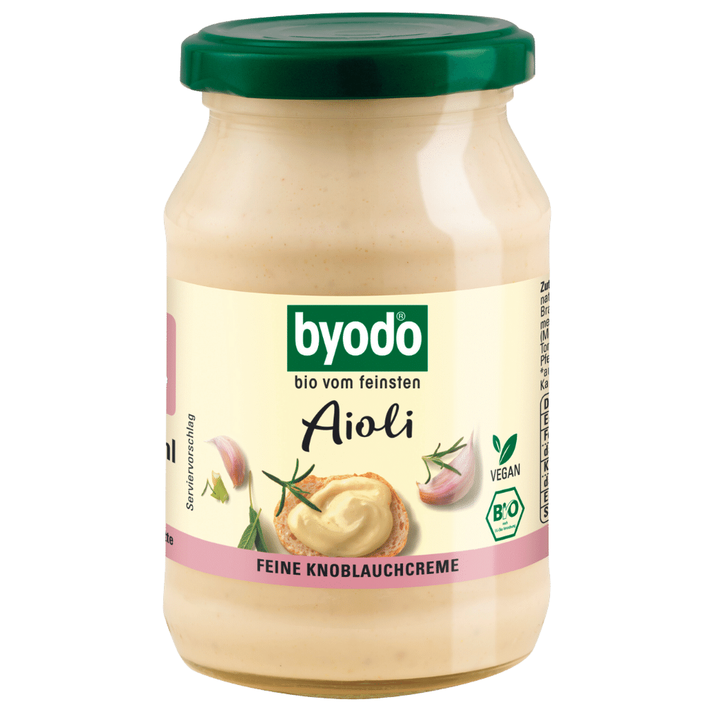 Für die Byodo Aioli werden feine 100% Bio-Zutaten wie milder Condimento Bianco und Olivenöl, nativ extra mit frischem Bio-Knoblauch verarbeitet. Di…