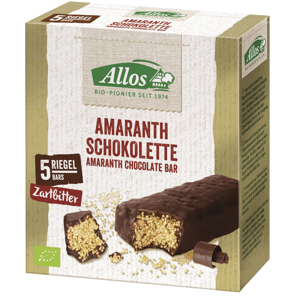 Genieße den perfekten Snack mit der Allos Amaranth Schokolette Zartbitterriegel. Dieser Riegel vereint die Kraft des Superkorns Amaranth mit der In…