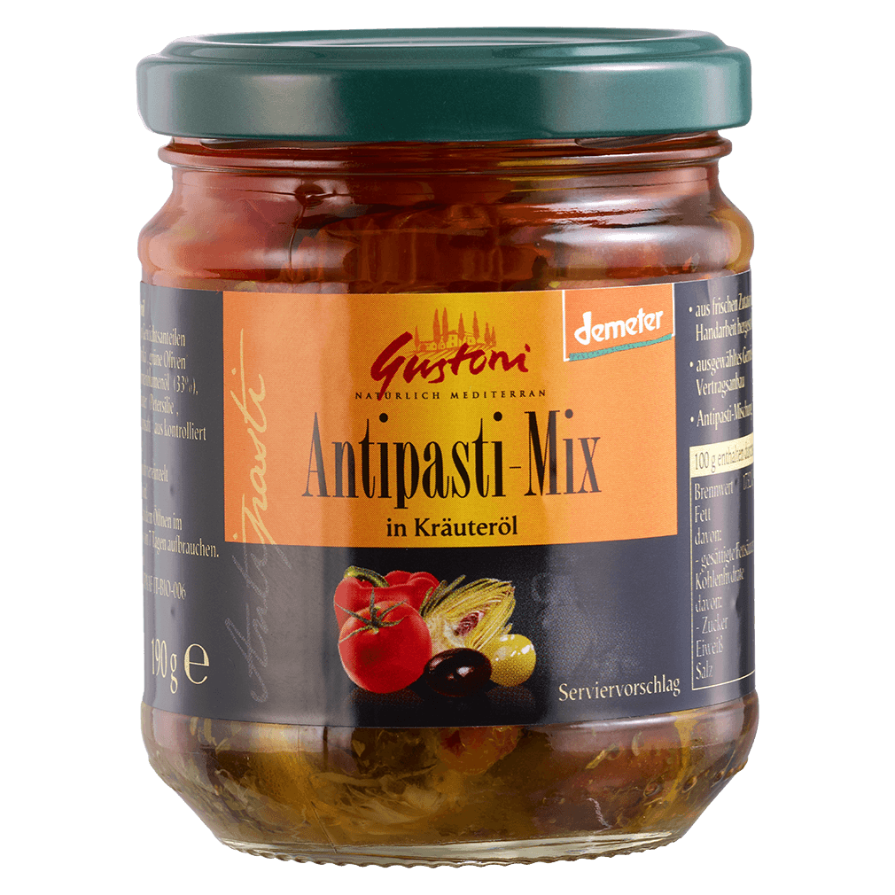 Mediteraner Mix aus getrockneten Tomaten, Artischocken, gegrillten Champignons, gegrilltenPaprika, schwarzen und grünen Oliven. aus frischen Zutate…