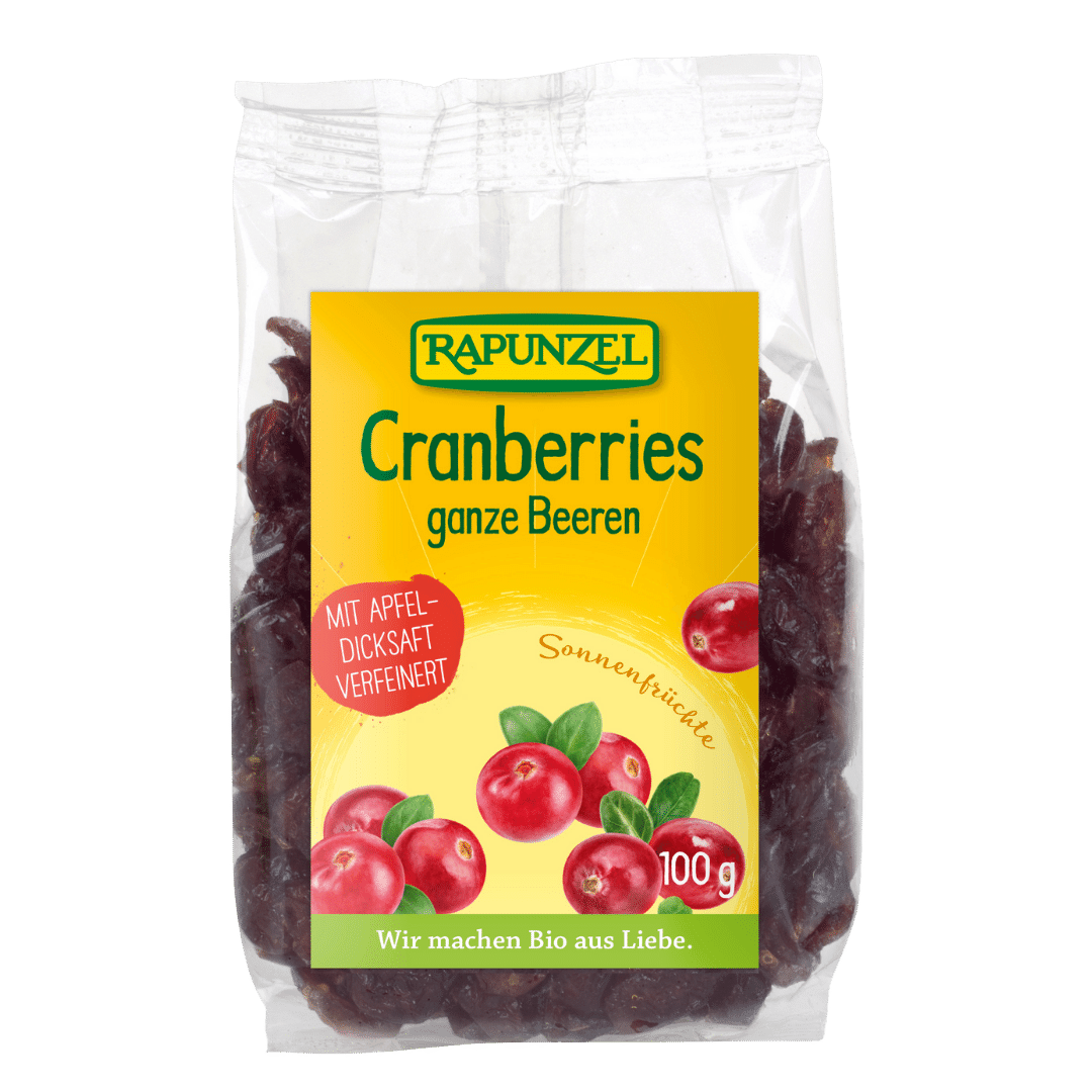 Diese Bio Cranberries von Rapunzel stammen aus traditionellen Anbaugebieten in Kanada und werden als ganze Beeren schonend verarbeitet. Ihr fein-fr…
