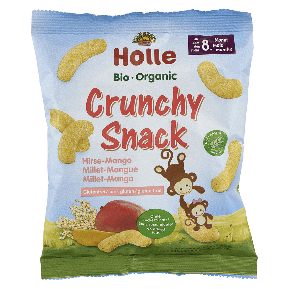 Die Holle Bio Crunchy Snacks Hirse Mango sind der perfekte Snack für Babys ab dem 8. Monat, die eine gesunde und schmackhafte Knabberei genießen mö…