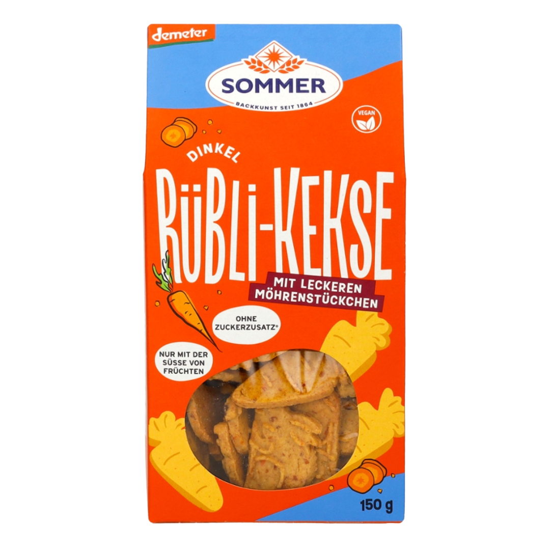 Unsere feinen Dinkel Rübli-Kekse erhalten ihre angenehme Süße durch Demeter-Sultaninen und getrocknete Aprikosen.