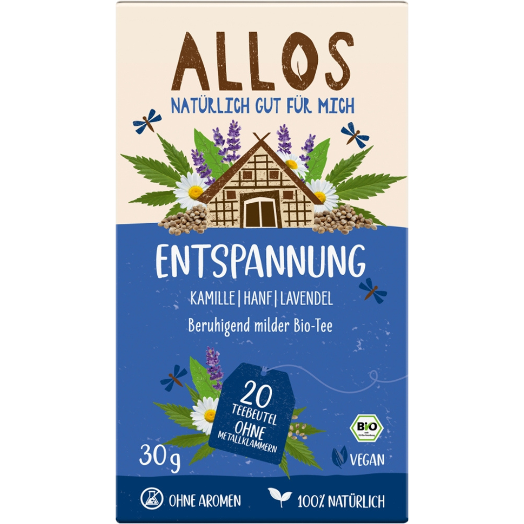 Der Bio Entspannung Tee von Allos ist eine sorgfältig komponierte Mischung aus ausgewählten Bio-Kräutern. Tulsi, Kamille, Zitronenmelisse, Hanfsame…