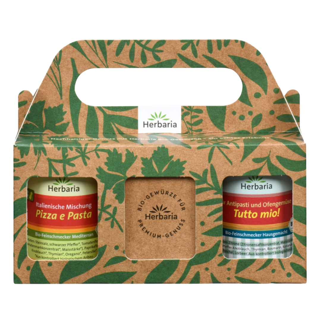 Das Herbaria Bio Gewürze Geschenkset Mediterran bringt mediterrane Aromen direkt in deine Küche. Die Gewürzmischungen ?Pizza e Pasta? und ?Tutto mi…