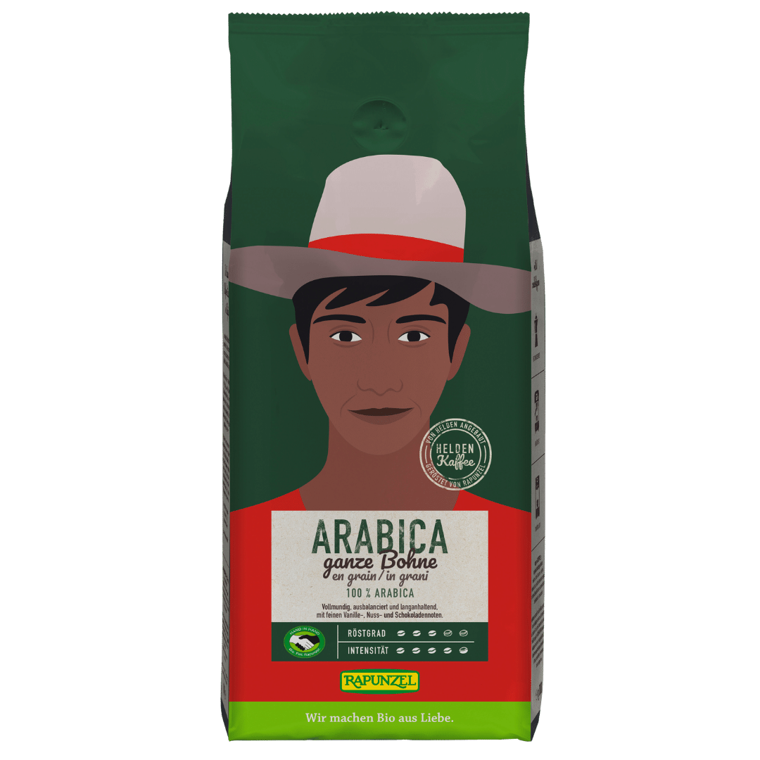 Bio Heldenkaffee Arabica, ganze Bohne (1 kg) steht für vollmundigen Kaffeegenuss in höchster Bio-Qualität. Diese 100 % Arabica-Bohnen stammen aus n…