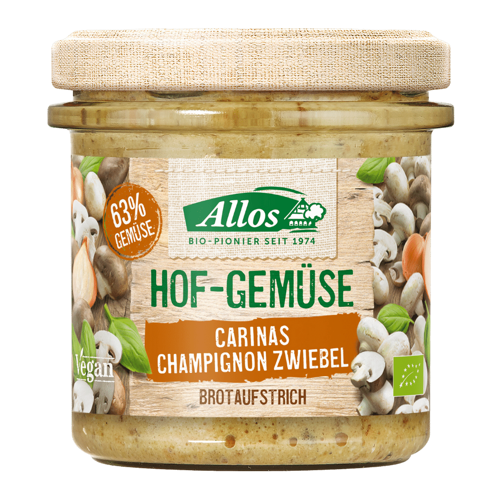 Ein Aufstrich, der den wahren Geschmack des Gemüses auf den Punkt bringt: Der Hof Gemüse Carinas Champignon Zwiebel von Allos vereint zarte Champig…