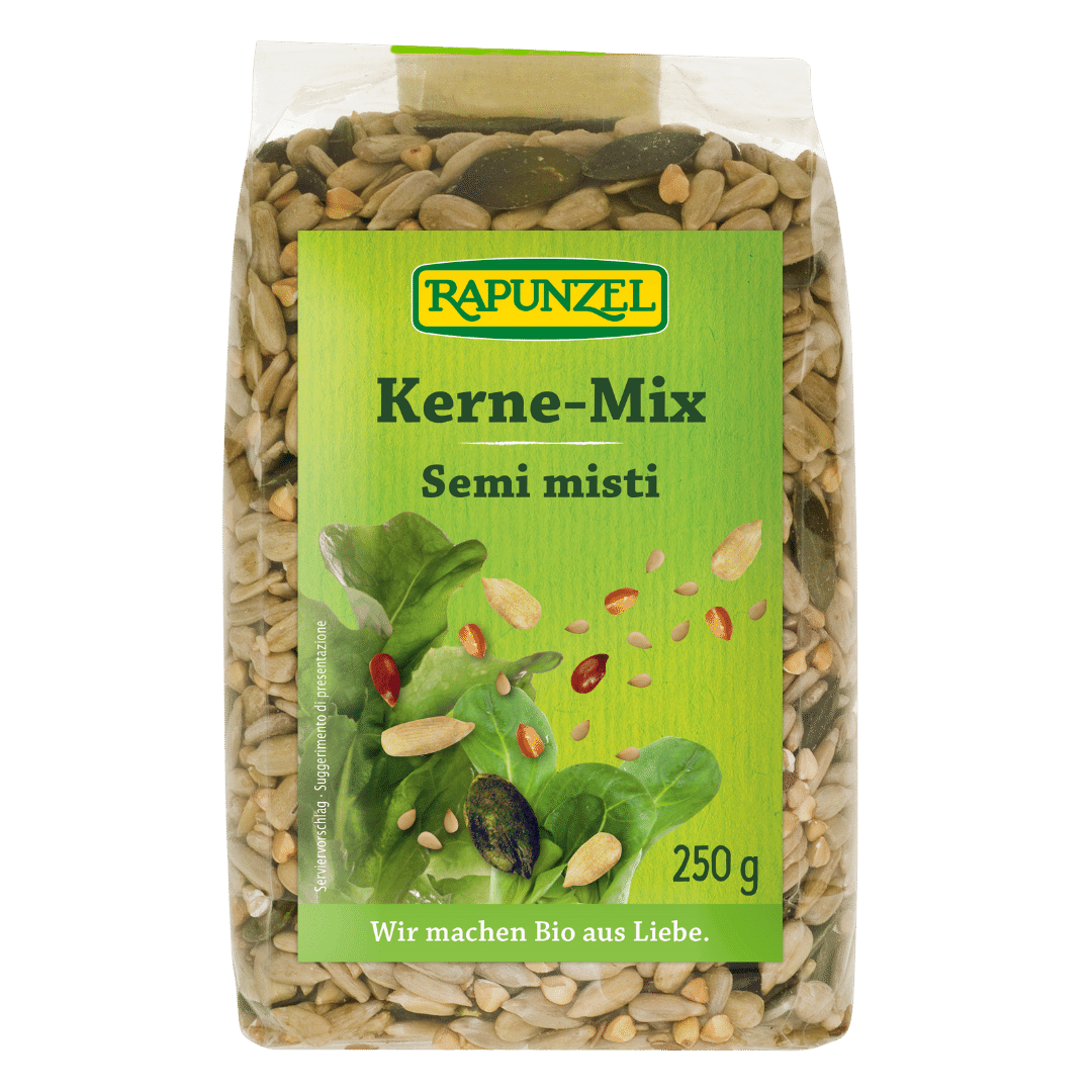 Knackig, nussig und voller Aroma: Der Bio Kerne-Mix von Rapunzel vereint gerösteten Buchweizen und Kürbiskerne mit Sonnenblumenkernen, Leinsaat und…