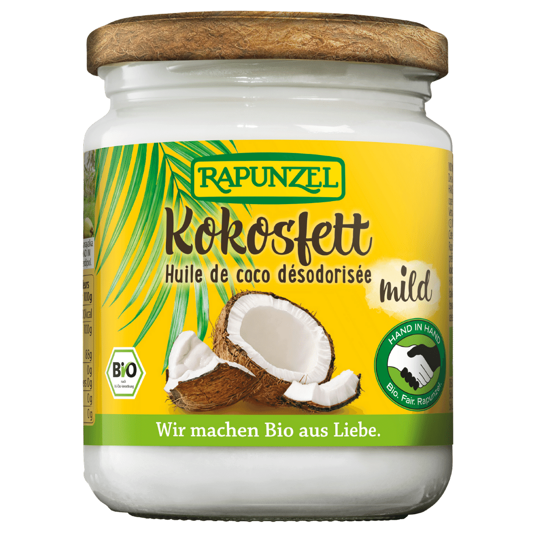 Neutral im Geschmack, hitzestabil und vielseitig verwendbar: Das Bio Kokosfett mild von Rapunzel ist eine praktische Alternative zu Butter, Margari…