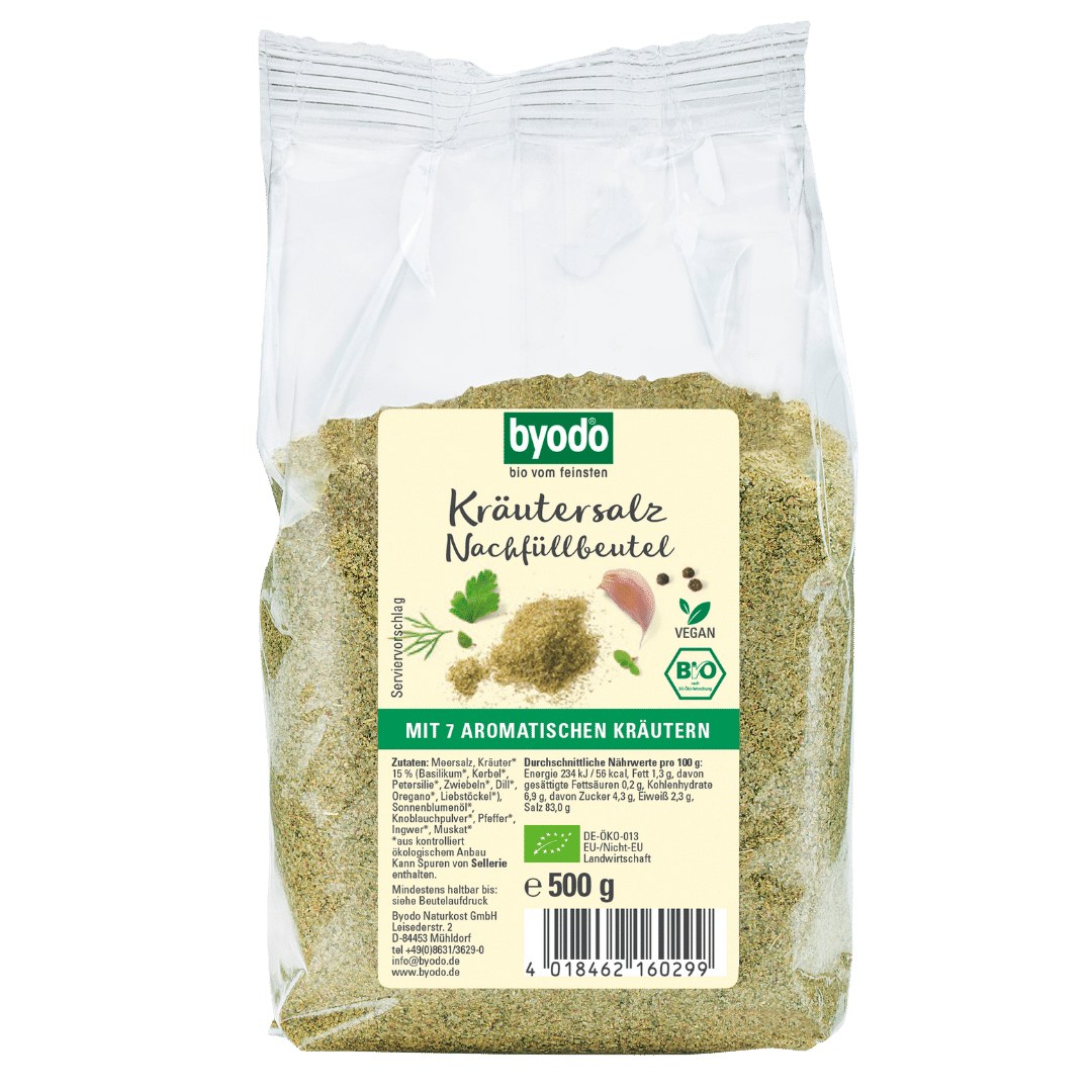 Das Byodo Kräuter Salz ist eine exquisite Mischung aus feinkörnigem Salz und 15% schonend getrockneten Bio-Kräutern wie Kerbel, Petersilie, Liebstö…