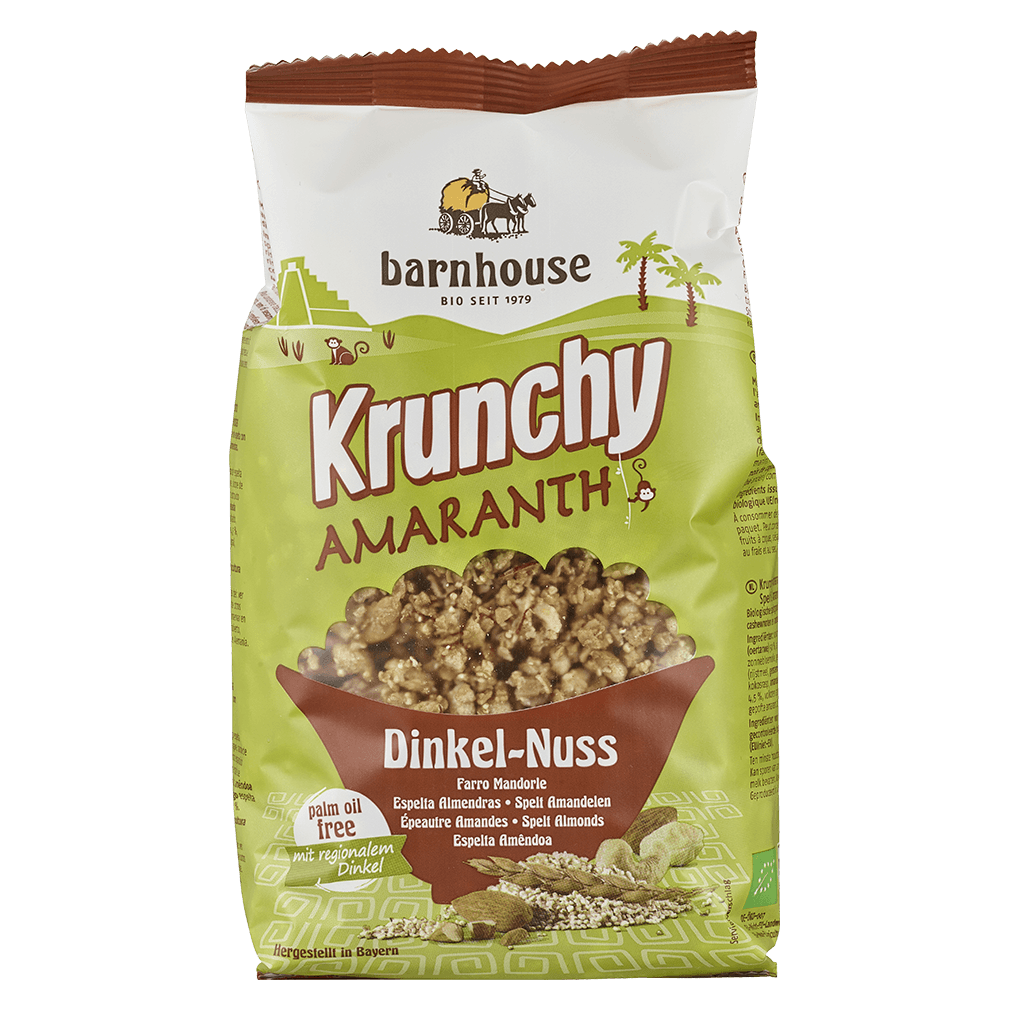 Im Krunchy Amaranth Dinkel-Nuss harmoniert das Urgetreide mit Cashew-Nüssen und feinen, gerösteten Mandelstiften. Alternativ gesüßt mit Agaven- und…