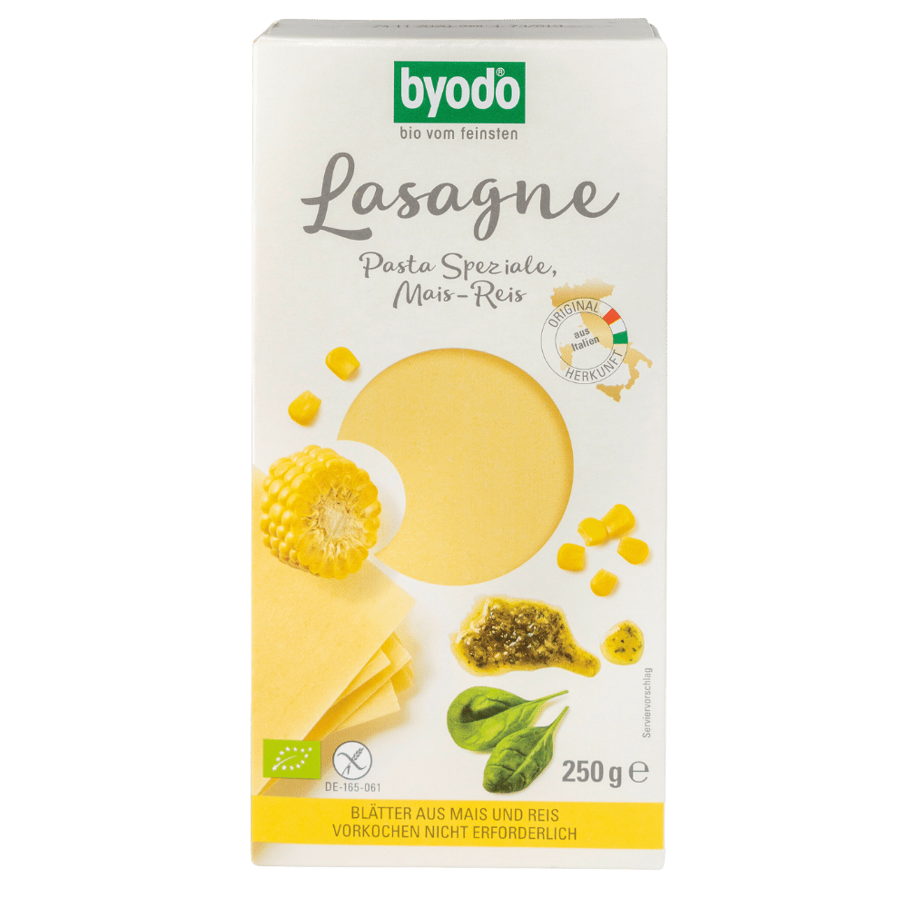 Mit der Mais-Reis Lasagne von Byodo steht genussvolles Schlemmen auf dem Programm. Die schlanken Bio-Nudelplatten werden traditionell gewalzt und a…
