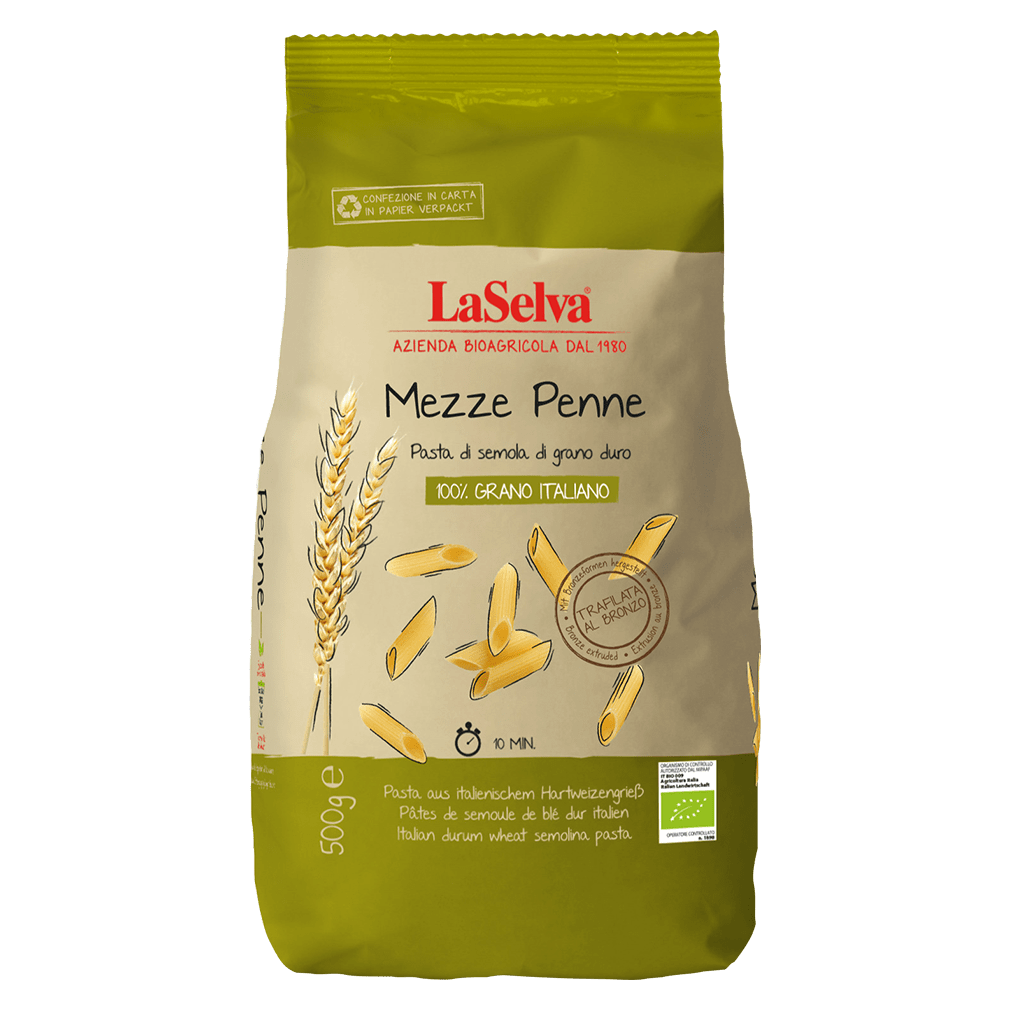 Diese kurzen Bio-Mezze Penne stehen für italienische Pasta-Tradition in moderner, nachhaltiger Form. Aus hochwertigem Bio-Hartweizengrieß hergestel…