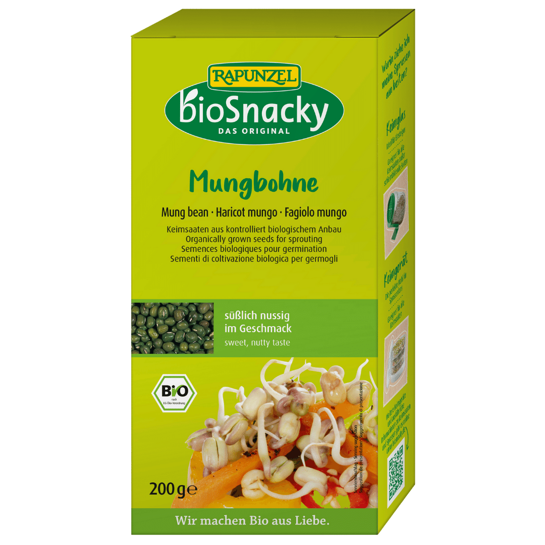 Diese Bio Mungbohnen aus dem Rapunzel bioSnacky-Programm sind ideal zum Selberkeimen auf der Fensterbank. Sie entwickeln innerhalb weniger Tage kna…