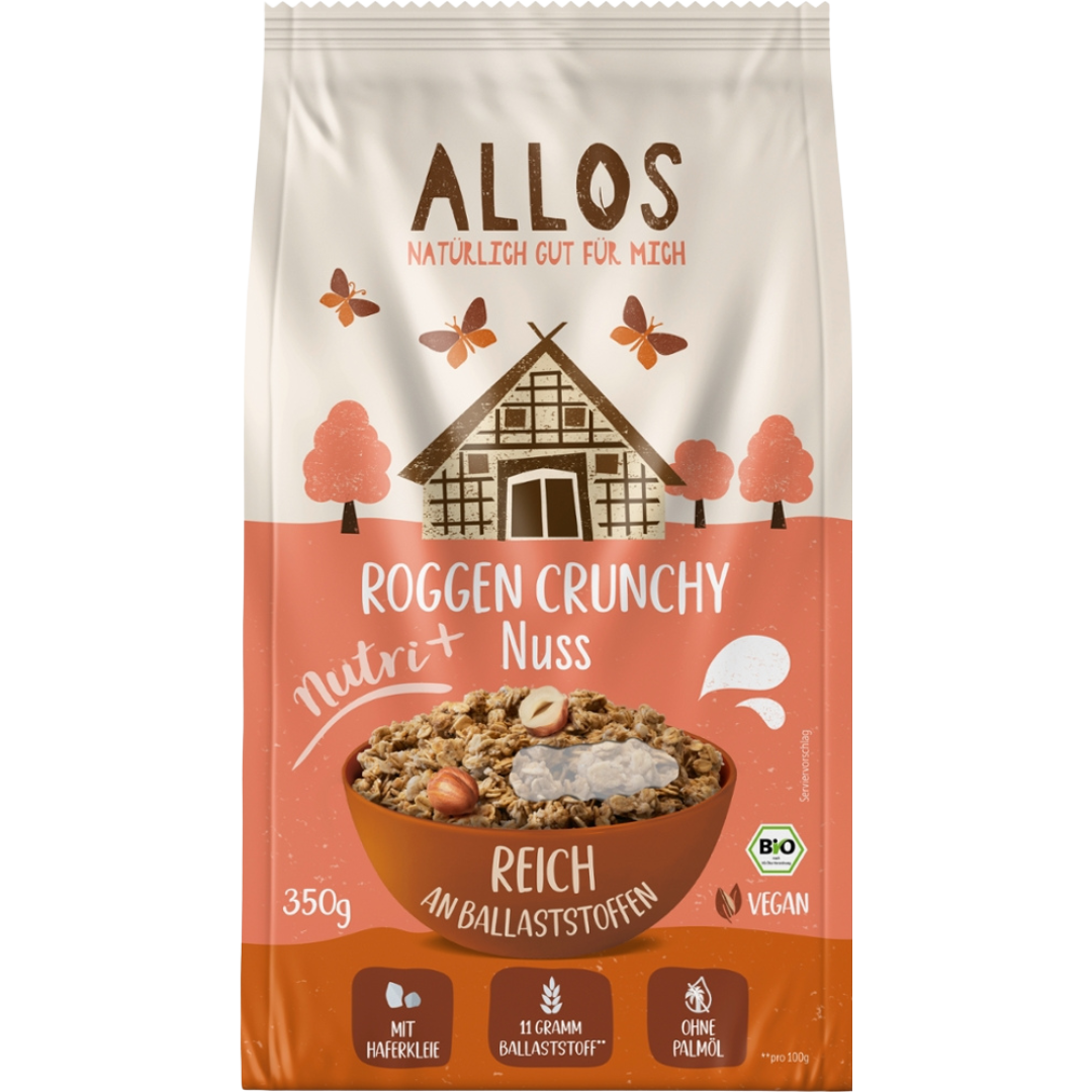 Knusprige Roggenflocken bilden die Basis dieses nussigen Müslis von Allos, das mit Haferkleie und knackigen Haselnüssen seine besondere Note erhält…
