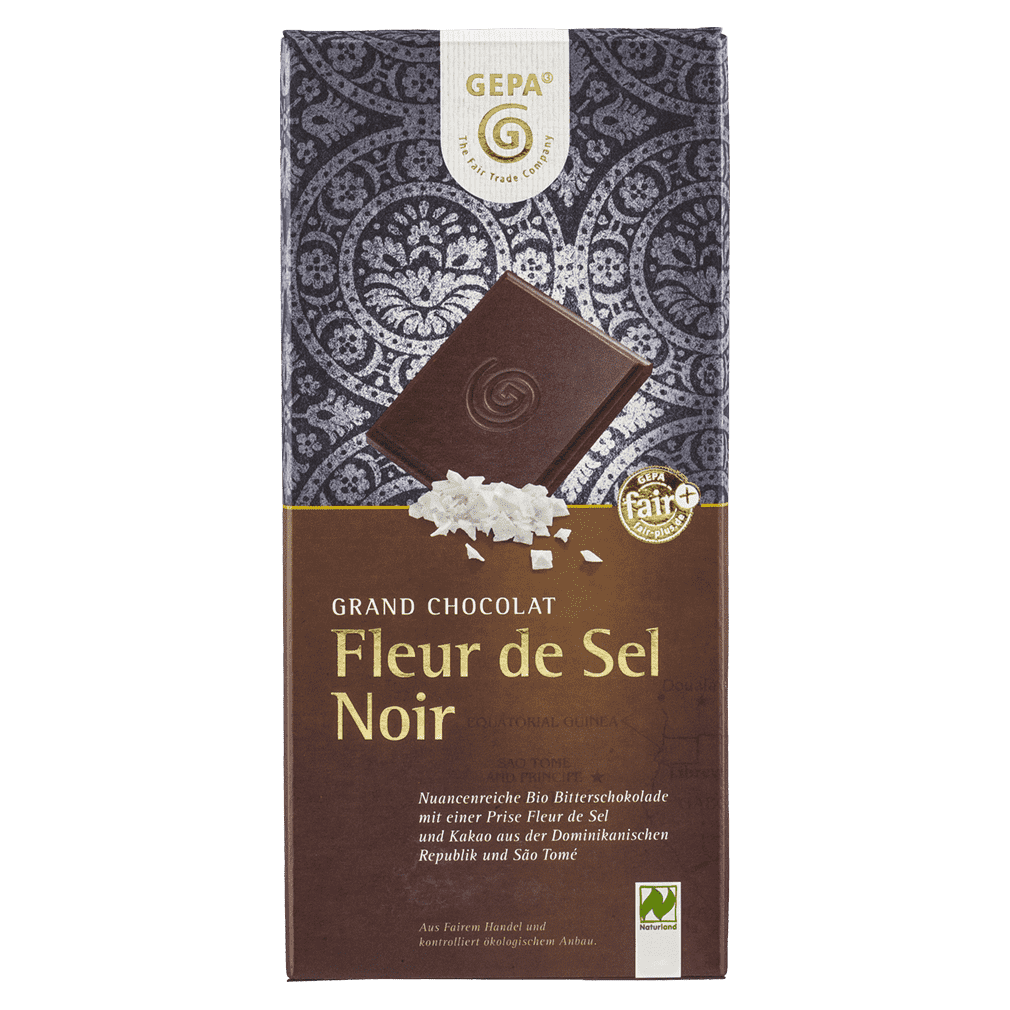 Die GEPA Bio Schokolade Fleur de Sel Noir verbindet die herben Noten von edlem Kakao mit einem feinen Hauch handgeschöpften Fleur de Sel. Diese har…