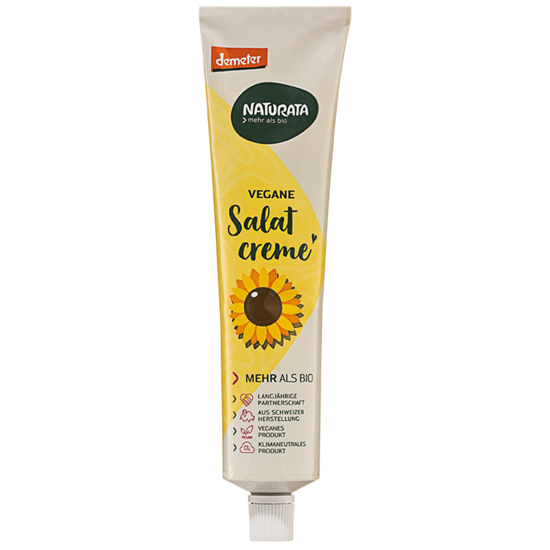 Statt Ei dient hier Sonnenblumenprotein als Emulgator. Zudem enthält die vegane Abwandlung der Mayonnaise weniger Öl und ist damit fett- und kalori…