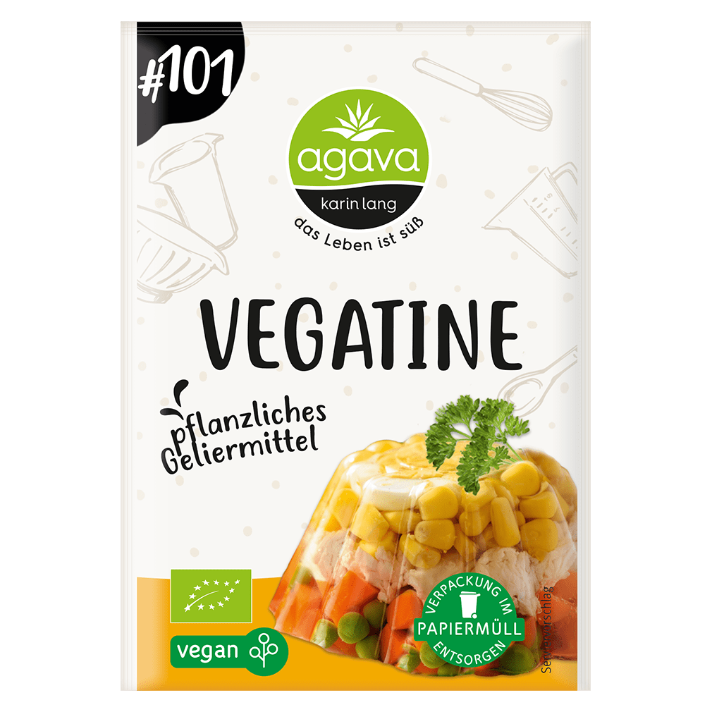 Vegatine ist unser pflanzlicher Gelatineersatz. Die geschmacksneutrale Mischung aus Agar Agar und Pfeilwurz sorgt für eine schnittfeste Form. Vegat…
