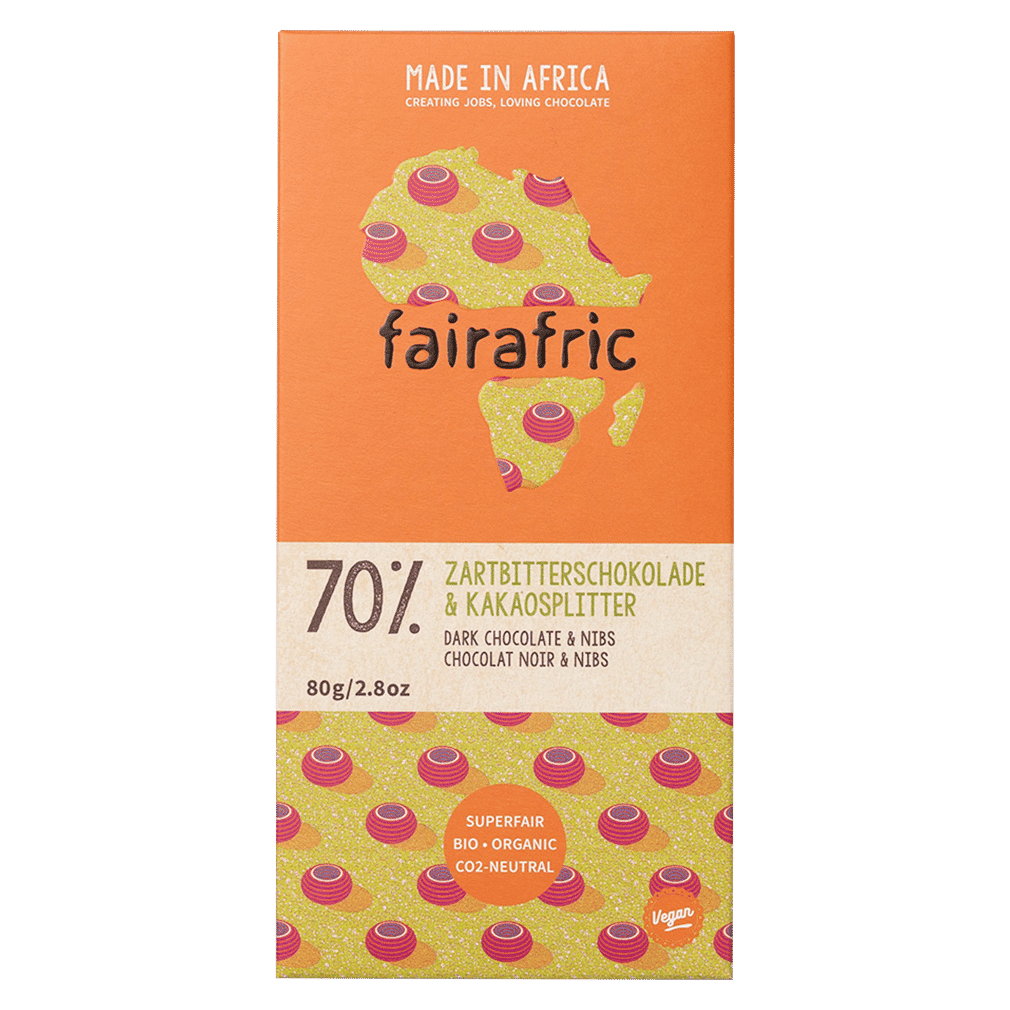 Die Bio Zartbitterschokolade & Kakaosplitter von fairafric vereint intensiven Zartbittergeschmack mit einer knusprigen Überraschung. Die knuspr…