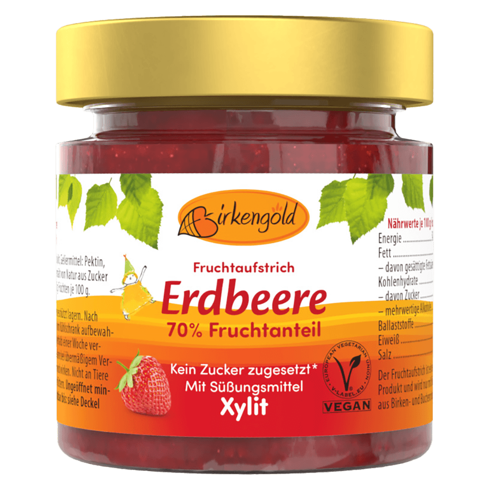 Birkengold Fruchtaufstrich Erdbeere besteht zu 70 % aus ausgewählten Biofrüchten. Zum Süßen wird ausschließlich Birkengold Xylit verwendet. Ein wen…