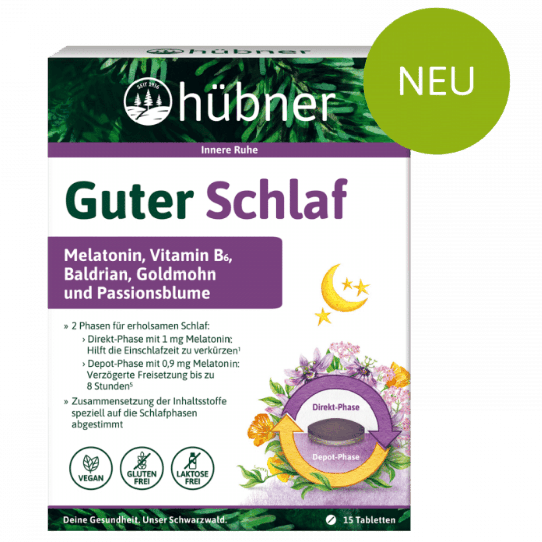 2 Phasen für erholsamen Schlaf Die spezielle 2-Phasen-Formulierung von hübner® Guter Schlaf unterstützt deinen Schlafzyklus optimal. Die Tablette s…