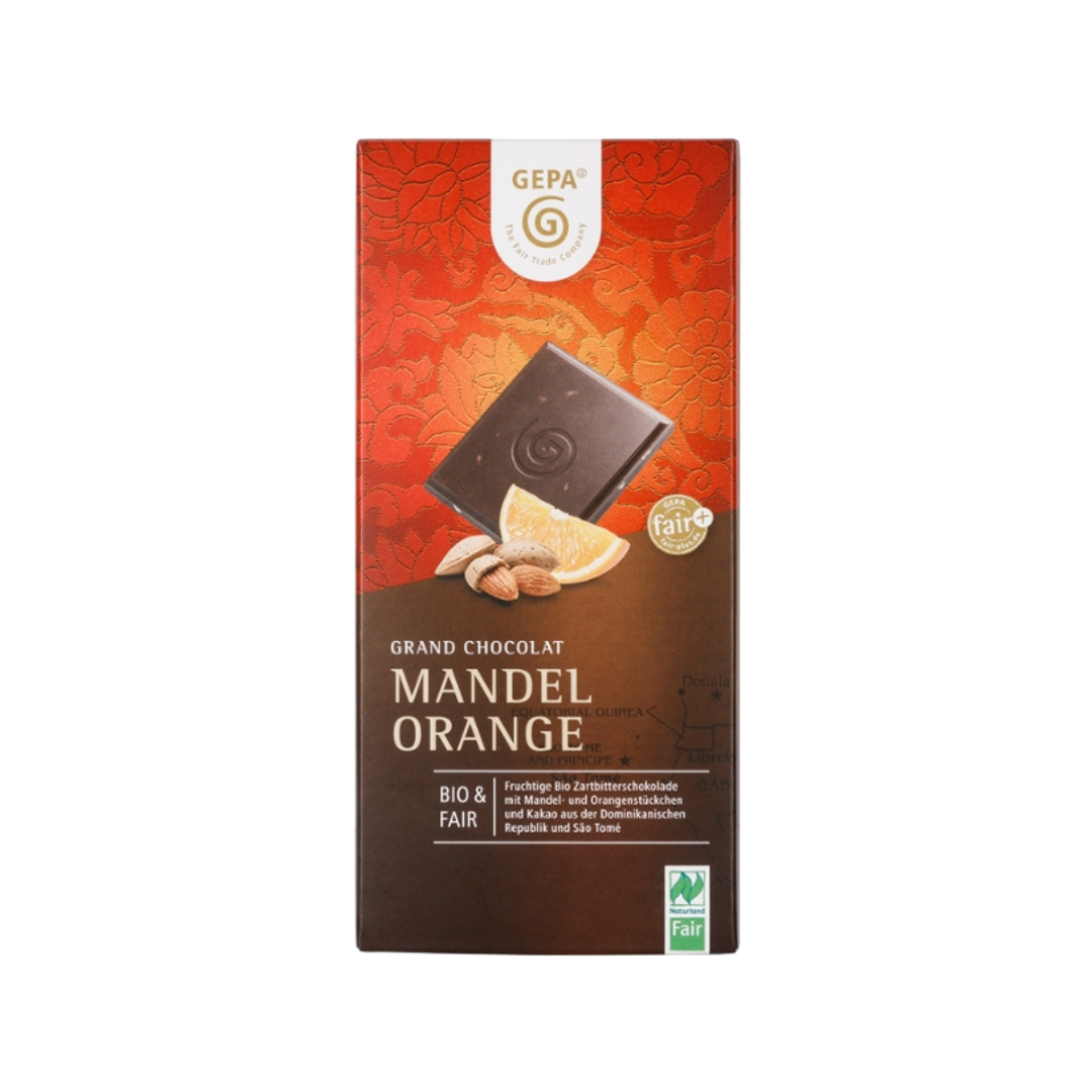 Die Kombination aus knackigen Mandeln und fruchtigen Orangen verleiht dieser zartschmelzenden Schokolade von GEPA ein einzigartiges Geschmackserleb…
