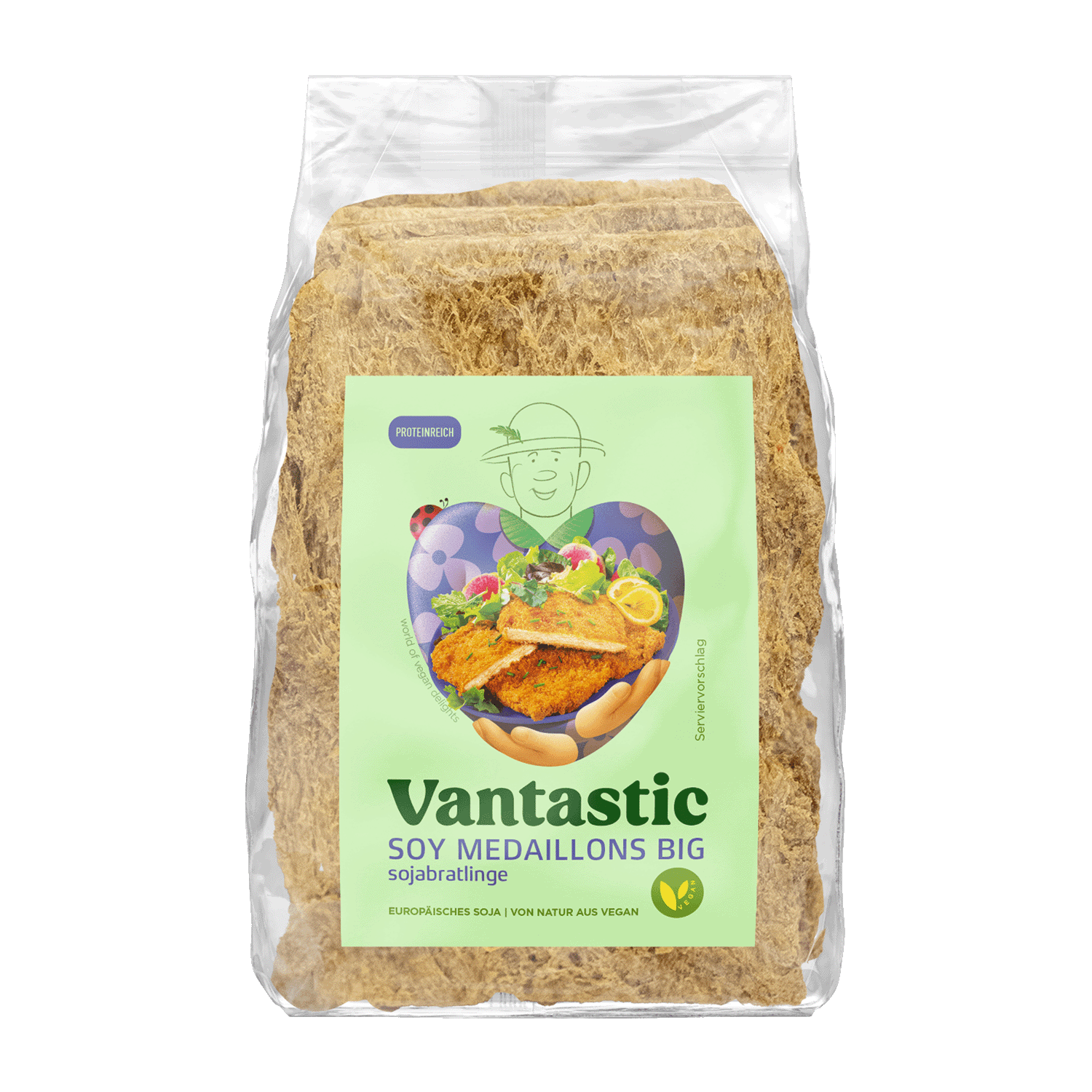 Sojabratlinge für alle Fälle Fein und vielseitig: Mariniere oder paniere sie, wirf sie auf den Grill oder hau sie in die Pfanne! Mach mit ihnen, was du willst, wie du es willst, wann du willst. Denn die Vantastic Soy Medaillons sind für die vegane Küche genauso praktisch wie abwechslungsreich. Von ihrem köstlichen Geschmack ganz zu schweigen. Das Beste: Kulinarisch kannst du dich mit ihnen richtig ausleben. Die texturierten Sojabratlinge sind die unangefochtenen Alleskönner unter den Sojaf…