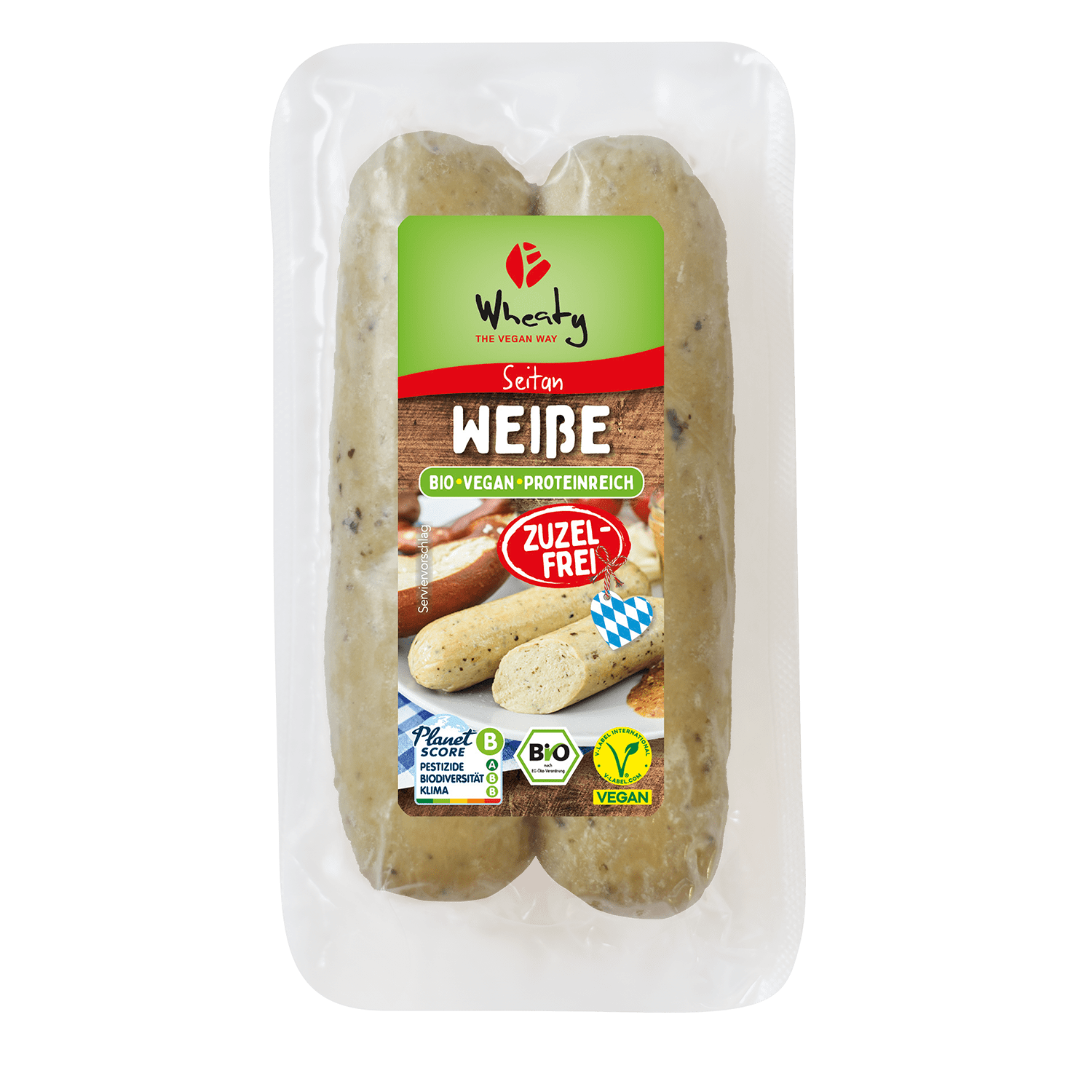 Vegane Bio-Seitanwurst – einfach super! Koan Warten auf die Wies‘n, koan zuzeln: Die vegane Weiße von Wheaty kommt aus dem leicht siedenden Wasserbad, in dem ein dezentes Petersilienaroma entfaltet, direkt und verzehrfertig auf den Teller. Bissfest, Saftig im Geschmack und natürlich vegan. Alles was du sonst noch brauchst, sind ein bisschen süßer Senf und ein zünftiges Weißbier! Seit 30 Jahren vegan & bio Bei Wheaty müssen Veganer:innen wirklich auf so gut wie gar nichts verz…