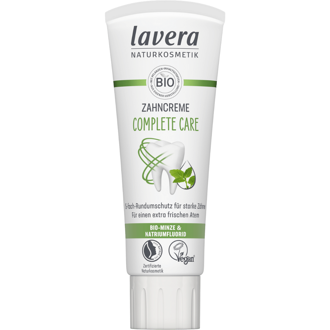 Die lavera Zahncreme Complete Care mit Bio-Minze und Natriumfluorid bietet 5-fachen Rundumschutz. Die hochwirksame Rezeptur mit Eukalyptus entfalte…