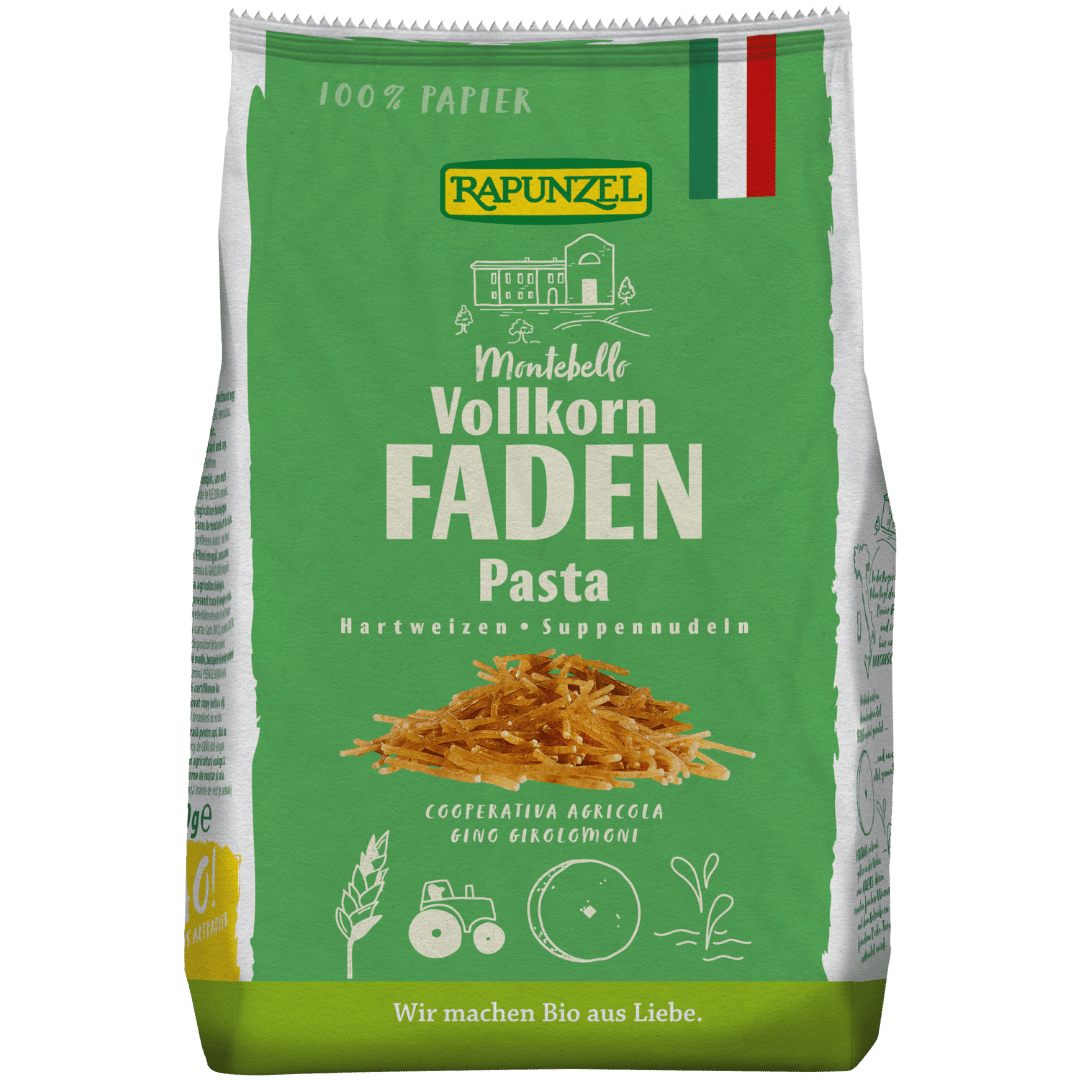 Fein, schnell zubereitet und vollwertig: Die Bio Faden Suppennudeln Vollkorn von Rapunzel sind eine beliebte Einlage für klare Suppen ? hergestellt…