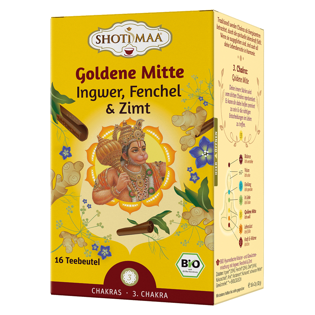 Shoti Maa Goldene Mitte ist eine ayurvedische Kräuter- und Gewürzteemischung mit Ingwer, Fenchel und Zimt. Scharfer Ingwer, exotischer Zimt und mil…