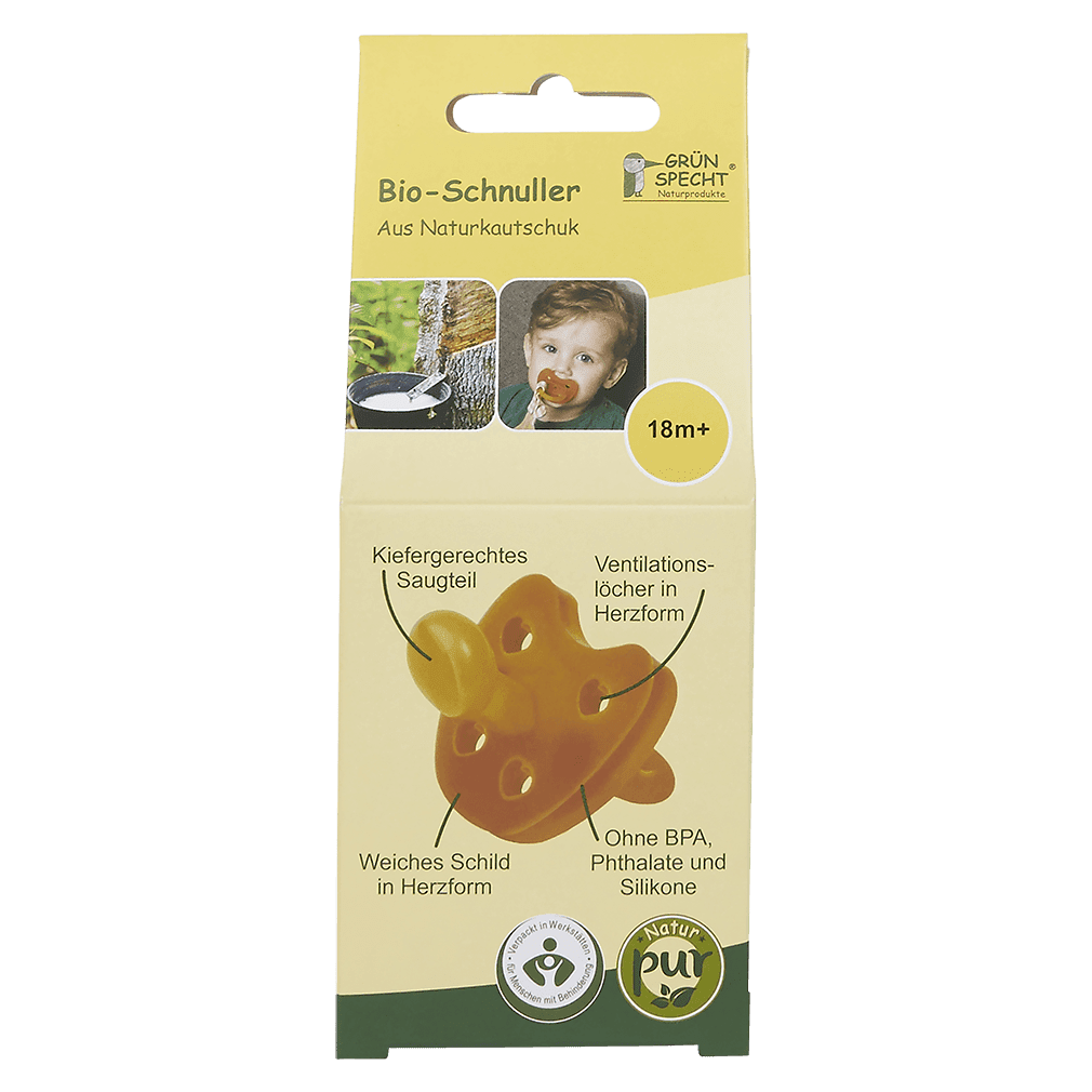 Der GRÜNSPECHT Beruhigungssauger wurde umweltfreundlich und nachhaltig aus Naturkautschuk produziert. Der gerade und weiche Schild in Herzform biet…