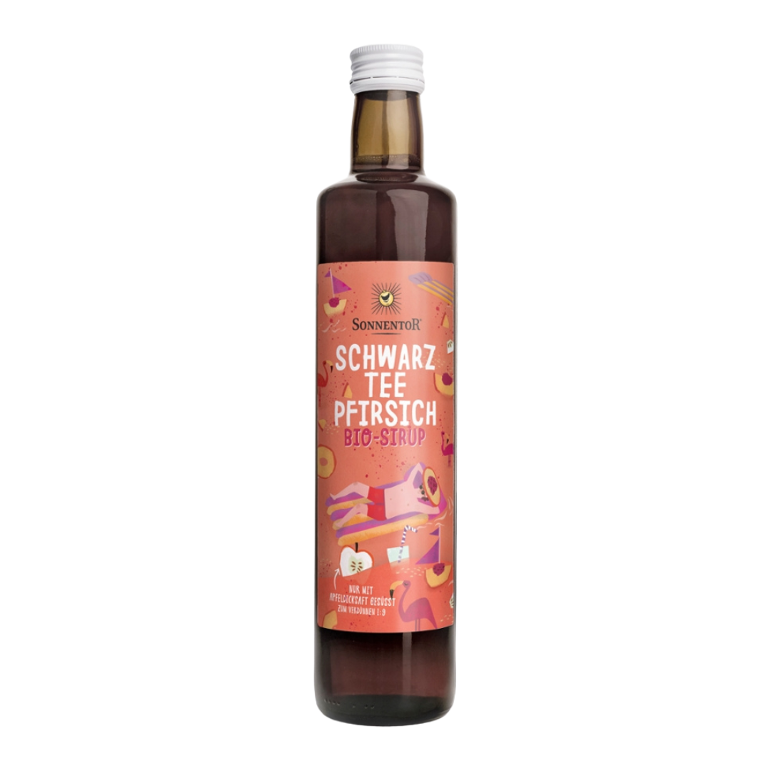 Der Bio Schwarztee-Pfirsich Eistee Sirup von Sonnentor bringt mit seiner fruchtig-herben Note eine erfrischende Abwechslung ins Glas. Der Sirup ver…
